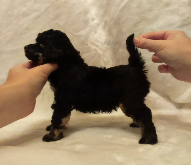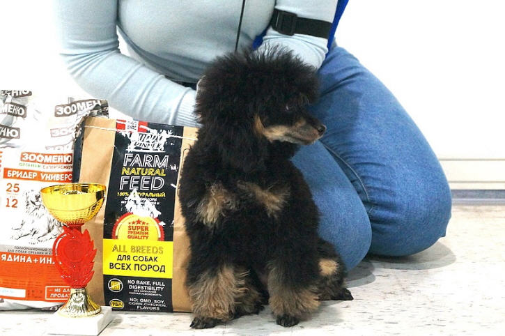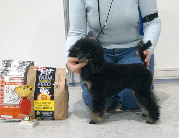 — хорошего формата, приятное «лицо» для тоя, шея хорошей длины, хороший выход и постав; углы сочленений выражены средне, хорошо себя «несет», яркий подпал, шерсть скорее шелковистая, мягкая, средней густоты, хороший завиток; хвост без заломов, но закидывает в движении