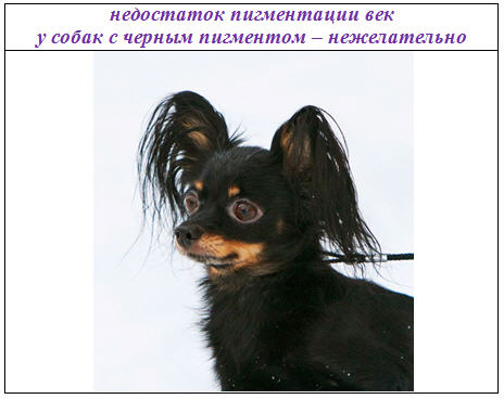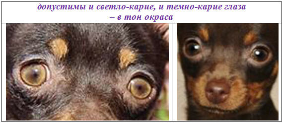 При окрасах с черным пигментом (черно-подпалый, рыжий с чернью, рыжий с черной мочкой носа) цвет глаз должен быть максимально темно-коричневым.