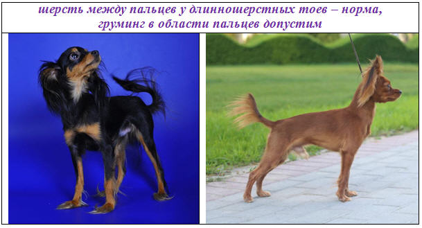 Комментарии к пункту «лапы»: пальцы на лапах и передних, и задних конечностей должны смотреть четко вперед. У молодых собак (беби, щенков, юниоров) можно допустить очень слабо выраженный, едва заметный размет. У взрослых собак можно допустить едва заметный размет с возможностью получения титула только при условии, что это единственный недостаток. У длинношерстных тоев между пальцами растет шерсть: у кого-то этот признак ярко выражен, у кого-то едва-едва. Так как излишне длинная шерсть делает лапу неопрятной, то в области лапы можно допустить груминг в виде окантовки вокруг пальцев. Однако он не обязателен.